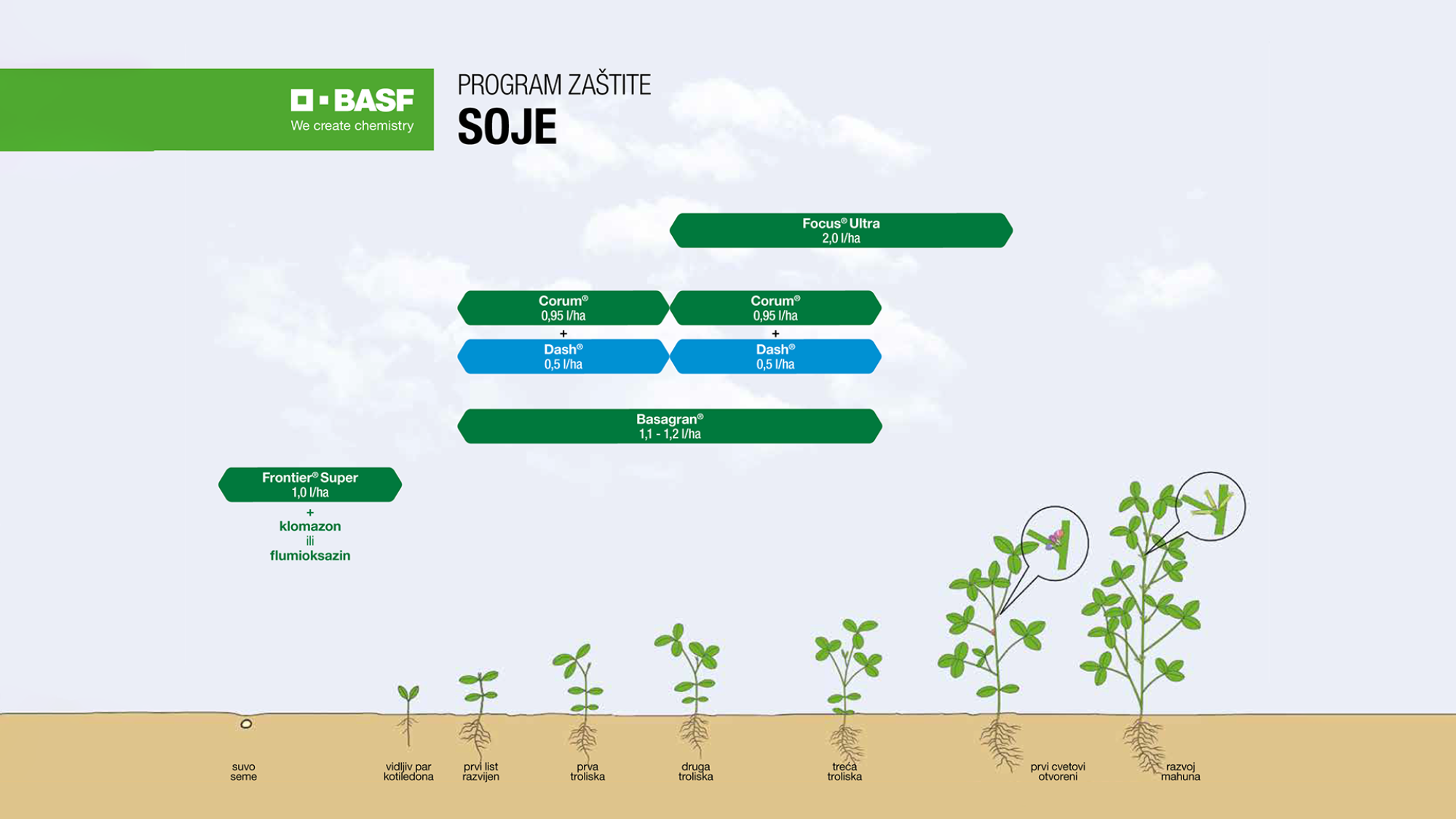 Kada soja nikne, a jave se korovi, treba koristiti herbicide koji su nežni prema soji a oštri prema korovima. Proizvod se može primeniti odjednom- u dozi 1,8 l/ha + 1,0 l/ha okvašivača Dash® ukoliko na parceli imamo ujednačeno nicanje korova. U praksi se pokazalo da korovi uglavnom niču neujednačeno, te kao rešenje za produženo nicanje korova preporučujemo tzv.split aplikaciju- 2x Corum® 0,9 l/ha + Dash® 0,5 l/ha.